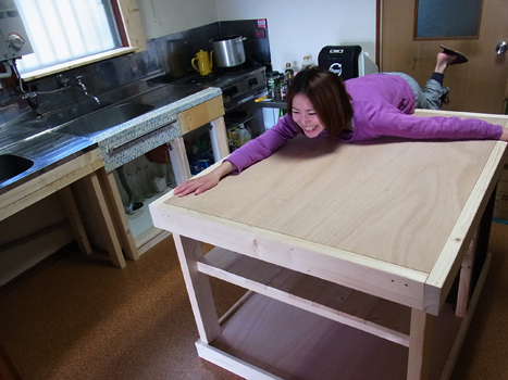 じゃじゃーん!!(…途中経過省きます。というか、地味に助手の作業をしていて写真無し。^c^)これまでの作業台は奥の扉側の方に納まりました。上部には大きな板が貼られる構造にし、周りもぐるりと木を張り巡らせて一体化。ステキな作業台ができました♡収納棚も在ります。上段の高さはボウルなどにばっちり合わせて作っています。下にもものを置けるよう、板を貼ってくれました。おおきーい♪わーいわーい!ちなみにあたしは155cm。ちょっと丸まれば寝れるぞい。