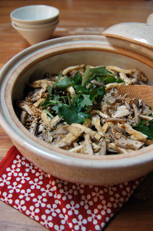 写真は今回のレシピのひとつ、きのこの土鍋炊き込みごはんです。