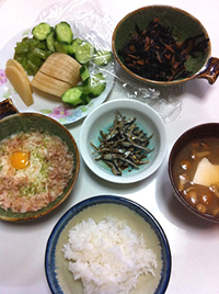朝ごはんは、なめこと豆腐のお味噌汁、ひじき煮、煮干しの素揚げ、お漬け物いろいろ、