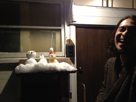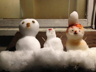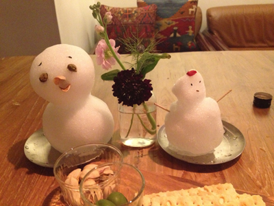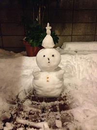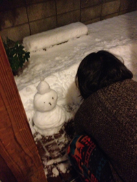 夕飯時、ウッドデッキに積もった雪で 相棒B氏と雪だるまをつくりました♪