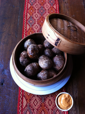 3)串がすっと通るようになったら蒸篭ごと食卓に出す。味噌マヨディップをつけて頂く。