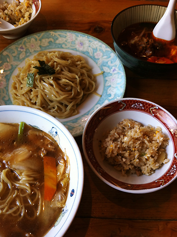 注文したのは五目そばと辛いつけ麺。ランチタイムには半ライスまたは半炒飯(おかわり自由)がつきます。つけ麺のタレは最後ガラスープで割ってスープにしていただきます。