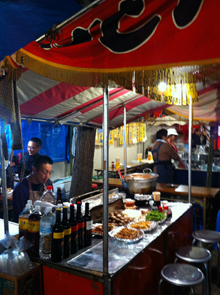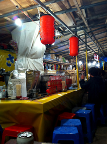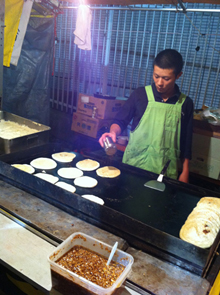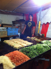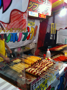 定番の露店以外にも本当に色々なお店があり、例えば割り箸にお好み焼きのようなものを巻き付けた「はしまき」とか、ラーメンバーガーなどなど盛りだくさん♪
