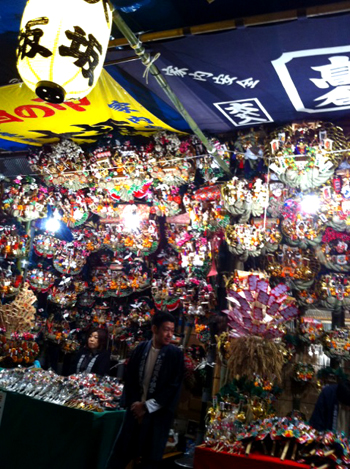 商売繁盛や家内安全を願う熊手や福財布、破魔矢の露店は、眩しい程きらびやか!