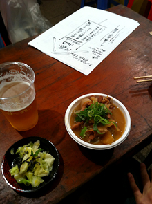 早く帰って家でゆっくりと乾杯しよう、なんて言っていたのに、その雰囲気を味わいたくてうずうず。結局モツ煮とビールで軽く一杯だけひっかけてから帰ったのでした。^q^