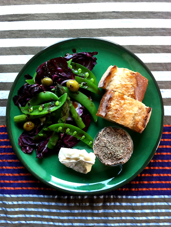添えたのはバケットとカマンベールチーズに、トレビス、スナップエンドウ、グリーンオリーブ、アスパラガスのサラダ。ドレッシングは