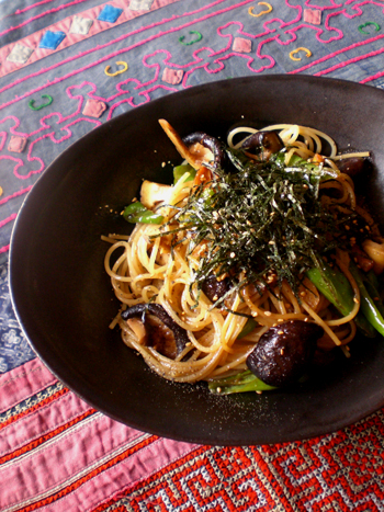 ある日のお昼に作ったのは、ふっくらと肉厚な椎茸と獅子唐芥子を使った和風パスタ。