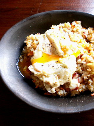 上には同じフライパンで揚げ焼きするようにして作ったフライドエッグをのせ、岩塩を少々と黒胡椒をたっぷりとひいて出来上がり♪