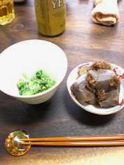 色々と頂きましたが、写真は菜の花の和え物とこんにゃくの煮物、そして神戸牛!