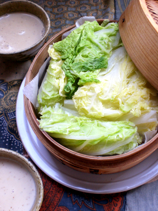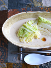 蒸した白菜は器に盛り、上から熱々の豆乳だれをかけてスープ風にして頂いてもいい。風味づけにお好みで胡麻油や辣油をちょっぴり垂らしても美味しいです。