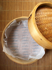 蒸篭に敷いたクッキングシートには金串でぽつぽつと穴を空け、蒸気がまわるようにしておきます。白菜は火通りに時間のかかる芯から先に蒸篭に入れます。少しくらい蓋が浮いても大丈夫。今回もたっぷりの白菜を蒸しましたが(写真右)、すぐにしんなりとして蓋がしっかりと閉まります。(※閉める際、火傷に注意!)
