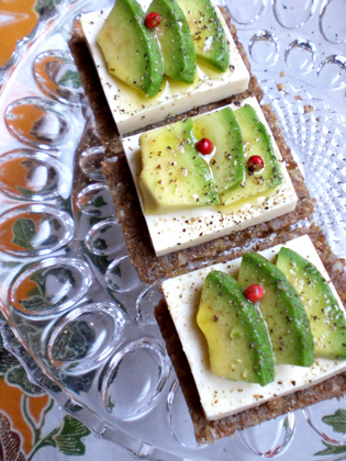 天然の食物繊維たっぷりのジャーマンブレッドを使った、一口サイズのオープンサンドです。合わせたのは絹ごし豆腐とアボカドに、シンプルにオリーブオイルと岩塩、黒胡椒。