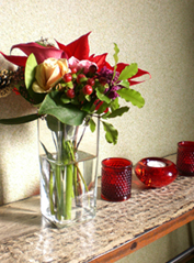 木曜日に久美ちゃんが手土産にと持って来てくれた素敵なお花と、普段使いの赤いキャンドルホルダーを並べたら、なんとな〜〜く、それらしい雰囲気かな?。。