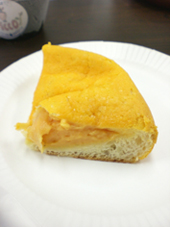 夕張メロンをたっぷりと使ったパン生地にビスケット生地をかぶせて焼き上げ、中にはなめらかな舌触りのクリームを詰めています。