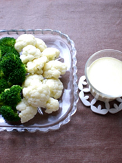 memo:ブロッコリーなどの緑の野菜は、茹でる際熱湯に塩を入れると色が鮮やかに仕上がります。カリフラワー、カブ、大根等の白い野菜は酢を入れるとより白く仕上がります。茹でる際には同じ湯でokですが、順番を間違えないように。酢に含まれる酸は、緑色を退色させてしまいますから、必ずブロコリー → カリフラワーの順で。(※緑になった湯は、酢を加えるとまた透明になります。手品みたいで面白い♪^^)