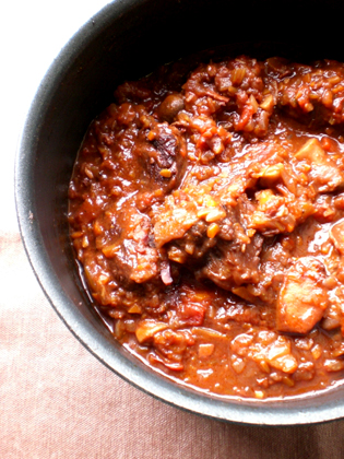 具材にはエリンギとマッシュルームを加え、たっぷりの赤ワインとトマト、