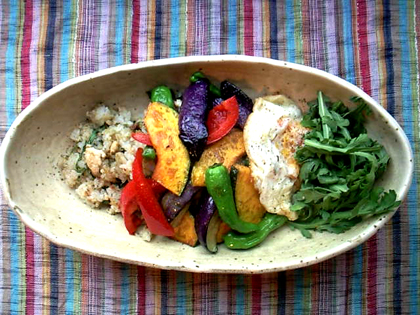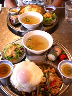 memo:野菜の素揚げはかぼちゃ、パプリカ、茄子の順に、170度の中温で色よく揚げ、獅子唐芥子は火をとめて予熱でさっと揚げています。フライドエッグはごはんを炒めた後のフライパンに油をやや多めに入れて熱し、たまごを割り入れて気味は半熟になる程度に揚げるようにして両面焼くのですが、普通の目玉焼きでもちろんok。今回は春菊でしたが、パクチーもばっちりの相性、のはず。^q^