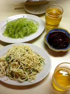 写真に写っているのは押し豆腐を千切りにした和え物と、緑色のはなんとレタス!なんなんだろう〜これ?芯の部分?茹でてるのかな。新食感ですごく美味しかった。^q^