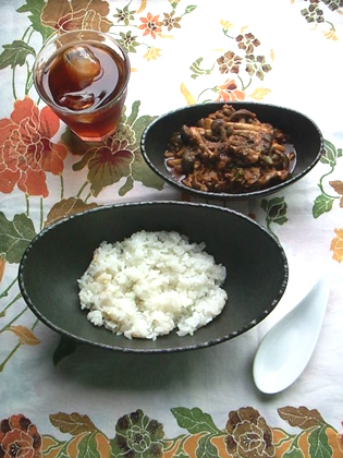 鉄鍋で炊いたお焦げつきのごはんと、熱々で辛い麻婆きのこ。