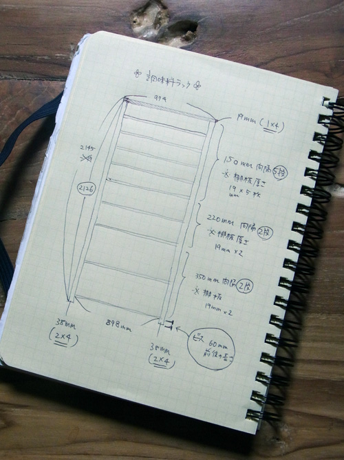 図面です。今回のラックは高さ2145 x 幅974mm。クリックすると大きくなります。