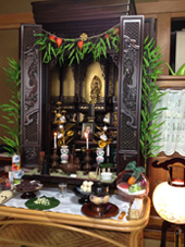 玄関には提灯(ちょうちん)が吊られ、お仏壇にはお供え物がされていました。
