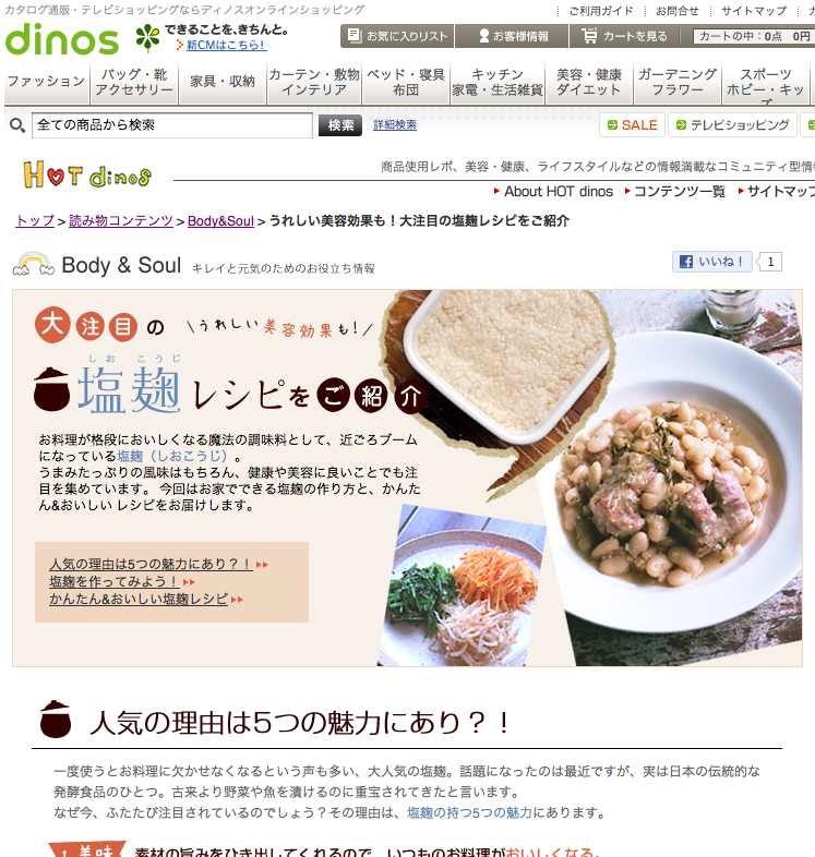 ディノス(dinos)さまのサイト内、Hot dinosのBody&Soulというコーナーにて、記事監修と合わせ、以前ブログでもご紹介しているものですが、塩麹の作り方と、塩麹を使ったレシピをご紹介しています。