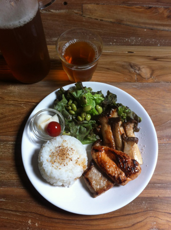 塩麹とコチュジャンに漬け込んだ鶏肉と豚肉をエリンギと一緒に焼いたもの。