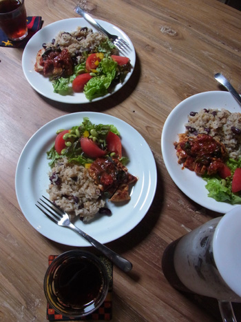 塩麹鶏とバジルの自家製トマトソース煮込みと、豆とパルミジャーノのリゾット、サラダ、プーアール茶。3人で美味しく頂きました!ご馳走さまでした。^人^