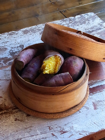 サツマイモを蒸かしたこの蒸篭は、直径18cmで二段重ねのもの。