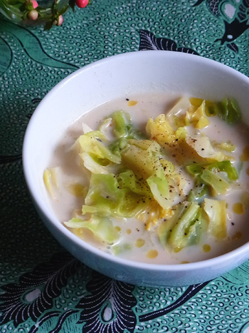 少量の水で蒸し煮したキャベツに豆乳を加え、味噌とほんの少しのブイヨンをつかって味つけしました。仕上げにオリーブオイルを垂らせば出来上がり♪