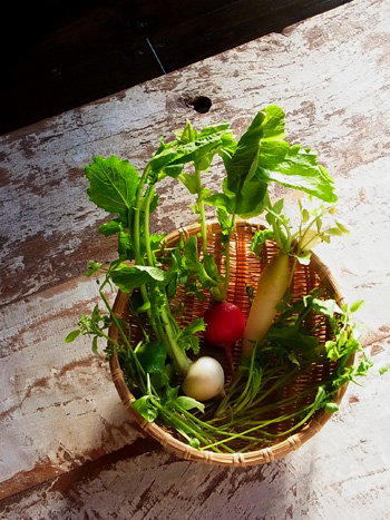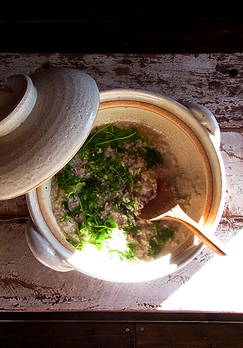 仕上げに細かく刻んだせりやなずななどを加え、蓋をして蒸らせば出来上がり。