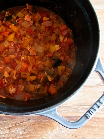 3)白ワインを加えアルコール分を飛ばしたらトマト缶とハーブ類(あればトマトピューレも)を加える。沸騰後は弱火で煮詰め、蛸を加えて一煮立ちさせたら味をみて塩または塩麹で味を整える。