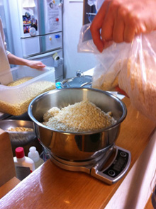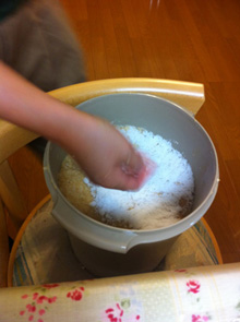 まずは大量の大豆を茹でつつ、その間に麹と塩を計り、大きな容器に合わせておきます。