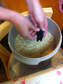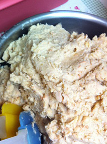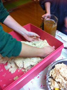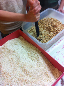 柔らかく茹でた大豆はそのままでもすごく美味しい!つまみ食いをしつつ、せっせとペースト状に潰します。これがなかなか力仕事!3人で教わりに行ったのだけれど、1人あたり5kgの仕上がり量なので、交替でひたすら潰しました!^c^
