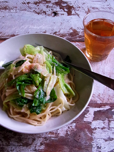 白いごはんで食べられればそれでいいのだけど、写真はつい先日、ごはんを炊く時間もなく作ったパスタ。雑な盛りつけでごめんなさい。^c^;