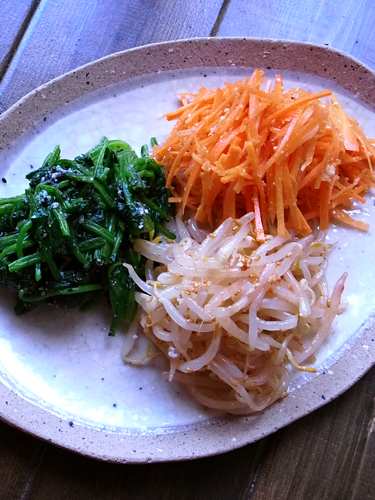 ほうれん草は水溶性のアクを含んでいるので、茹でたあとは水にとってしっかりとすすぎます。絞った後は醤油少々(分量外、小さじ1/4程度)をたらして更に絞ると味がぼけません(醤油洗い)。もやしはひげ根を除くと食感がよりよくなります。人参は皮ごと使い生で作っています。
