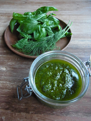 バジル、松の実、パルミジャーノチーズ、エキストラバージンオリーブオイル、にんにく、そして塩麹とディルを入れています。