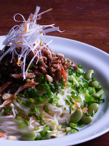 花椒を効かせた辛い肉味噌に納豆を添え、枝豆や桜えび、松の実を散らした麺。