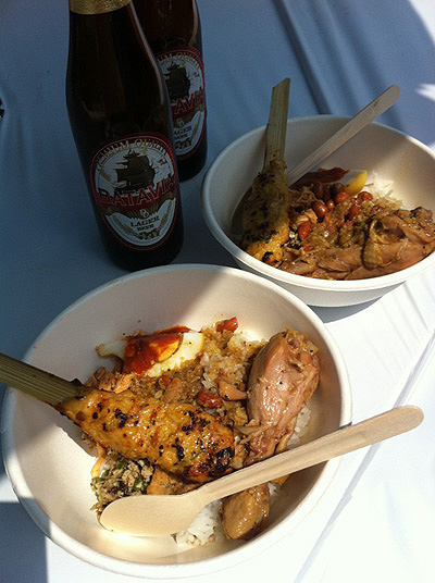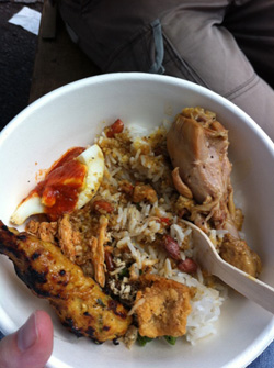 何やら美味しそうなお店を発見したので、ナシチャンプルとサテ リリッ(つくね風の串焼き。スパイスたっぷり!)をオーダーしました♪あとビール☆