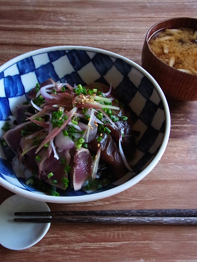 炙りたての鰹のタタキと、隠れてしまってみえないけど、鯛とマグロの漬けも一緒にトッピングしています。漬けも前日の残りのお刺身を醤油や酒に漬けたもの。