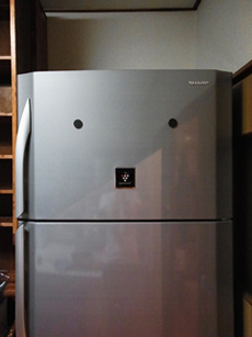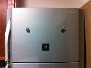 最後にもうひとつ、搬入に苦労した我が家の冷蔵庫ですが、マグネットが目みたいにみえてなんだかかわいいので、この際まつ毛もつけてみました。^c^