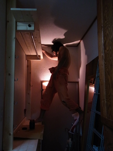 部屋にあるものに布をかけ、食器棚を逆さまにし、あたしが食器棚を支えます。そしてB氏が丸ノコで思い切ってカット。