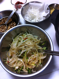 繊維に沿って薄切りにした新玉葱をさっと水にさらし、水気をしっかりと切ってから千切りのきゅうりと合わせ、叩き梅と金胡麻、少量の醤油で和えるだけ。