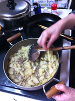 3)じゃがいもは皮をむき、5mm厚さくらいにスライスして、水にさらすことなく一緒に炒める。ここでも味つけをし、その後水分を加え(ひたひたくらいかな?)蓋をして煮込む。