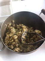 5)マッシャーで粗めに潰し、粗熱がとれたら成形する。