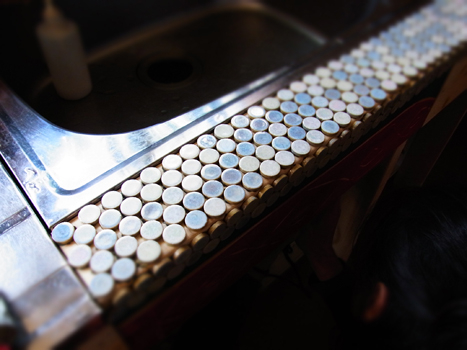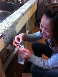あたしも参加♪やっほ〜い。地味な助手の仕事も好きだけど、やっぱり自分で出来るとうれしい♡タイルは四角にする?丸にする?なんていいながら、丸くて小さなパール色のタイルに決めました。きらきら。