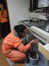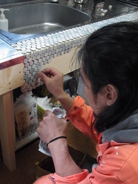 そして程よく(て、難しそう。。^〜^)乾いてきたら、水気を含ませたスポンジでタイルの上にかかっている目地を拭き取ります。帰宅したルームメイトとんこさんも思わず見学。二人でオレンジ色。^m^