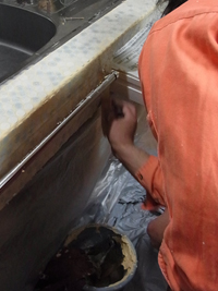 そして一部をはがし、ステンレスのタオル掛けを設置したら、さあ、いよいよ目地をいれます。