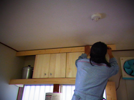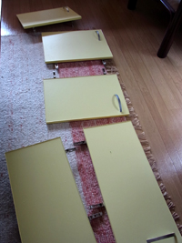 というわけでいよいよ塗装なのだけど、そのためには一旦棚を外さなくてはいけません。上の板を外し、固定した下部のビスを抜き、ガコっと棚を移動させて塗るのです。…た、たいへんじゃのう。^っ^;でも壁が汚れちゃうもんね。