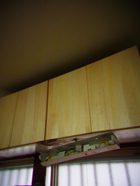 空いていた左端にも板を渡して収納量up!新しいとってをつけ、下部についている照明を隠すように板を貼りました。写真が暗くてごめんなさい。